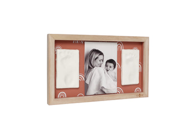 Ideal para gemelos o para mostrar el crecimiento de tu hijo, el Marco 2 Impresiones - Blue Abstrait ofrece un espacio generoso para huellas y una foto. Este marco largo se cuelga en la pared e incluye un fondo reversible azul con o sin un patrón de olas. El kit incluye arcilla hipoalergénica, un rodillo e instrucciones para crear fácilmente las huellas.