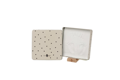 La Caja de Bebé Cuadrada - Olive Tree es un molde decorativo cuadrado que te permite crear un recuerdo único y personalizado de tu bebé. Esta bonita caja metálica te permite hacer huellas de manos o pies para inmortalizar estos momentos únicos. La Caja de Bebé Cuadrada - Olive Tree se combina armoniosamente con la decoración en la habitación del niño o en la sala de estar. La Caja de Bebé incluye una caja metálica cuadrada, un paquete de arcilla hipoalergénica, un soporte decorativo de madera, un rodillo de madera e instrucciones para crear fácilmente la impresión.