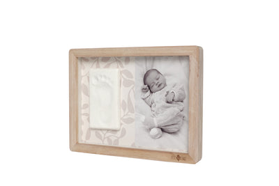 El Marco Clásico - Daisy Ochre está diseñado para exhibir tanto una fotografía como una huella de bebé. Este marco tradicional para colgar en la pared tiene un fondo reversible ocre personalizable con o sin patrón floral. El kit incluye arcilla hipoalergénica, un rodillo e instrucciones para crear fácilmente tu huella.