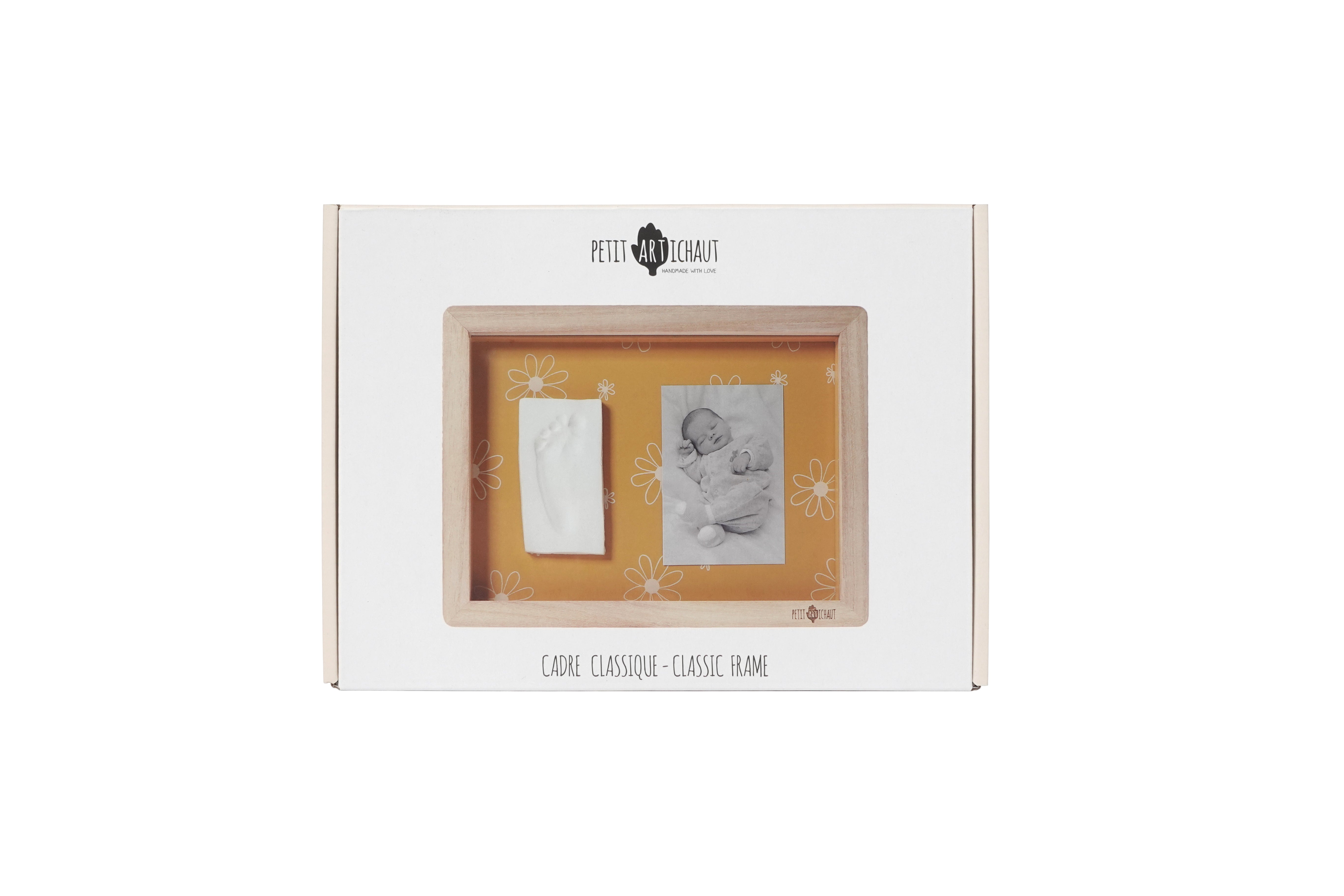 Le Cadre Classique - Daisy Ochre  est conçu pour mettre en valeur à la fois une photographie et une empreinte de bébé. Ce cadre traditionnel à accrocher au mur possède un fond recto verso personnalisable de couleur ochre avec ou sans motifs fleuris. Inclus dans le kit, de  la pâte hypoallergénique, un rouleau et un descriptif pour créer facilement votre empreinte.