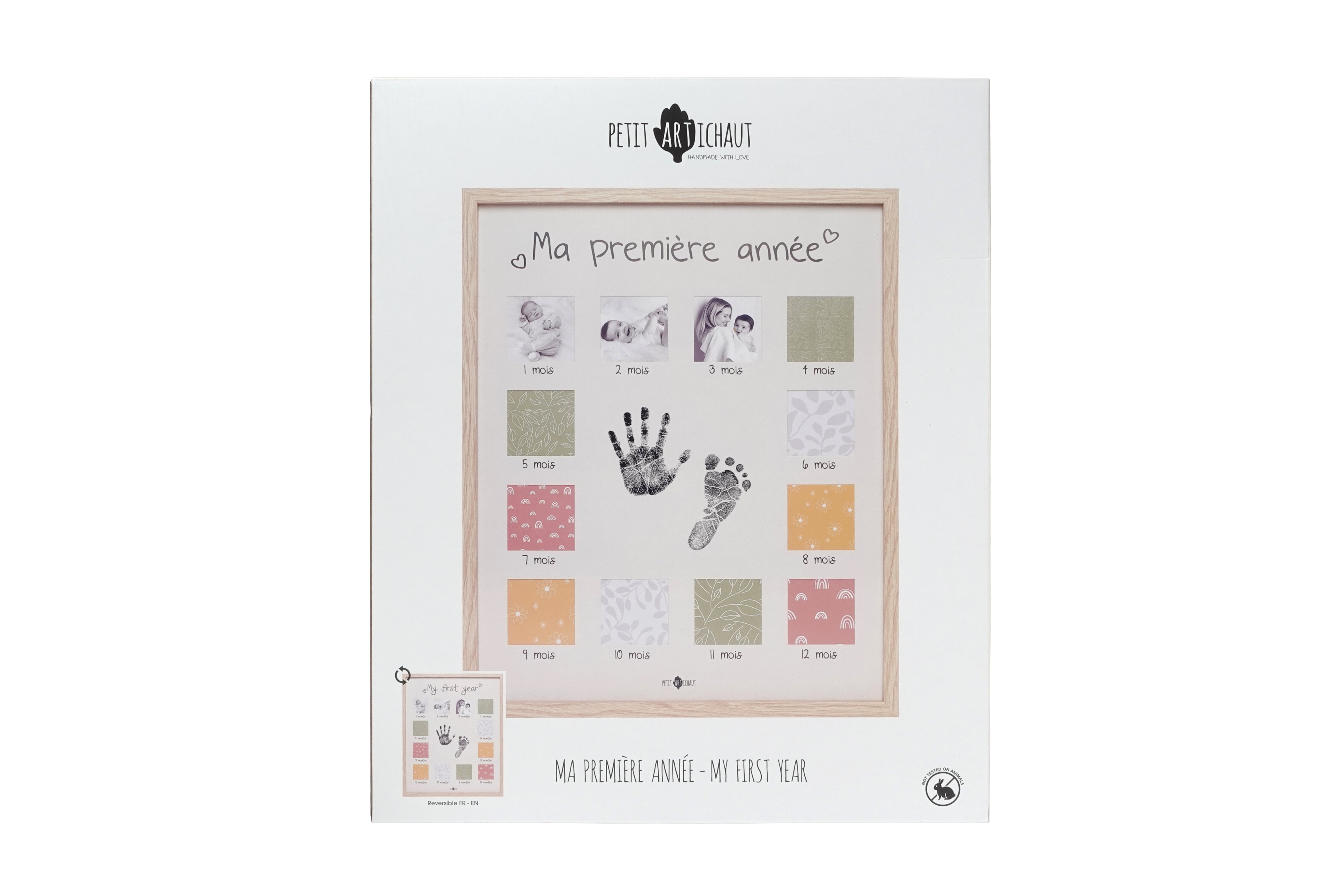 Le Cadre Ma première année permet d'afficher fièrement les photos de l'évolution de bébé sur un an et d'y apposer une empreinte avec de l'encre sans transfert.